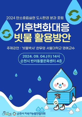 송경환 순천지속협 상임의장은 “이번 포럼을 통해 빗물이 소중한 자원으로 인식되기를 바라며, 홍수 방지, 수자원 활용, 에너지 절감 효과 등 기후위기 대응을 위한 순천의 지속가능한 물순환 관리방안이 마련되는 계기가 되길 기대한다”고 밝혔다.