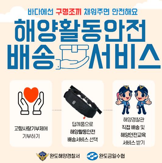 ‘해양활동안전 배송서비스’란 개인이 완도군에 기부를 하고 답례품을 배송하고자 하는 주소지를 적으면 완도해경서 관내의 경우 경찰관이 해당 주소에 직접 방문하여 ‘벨트형 구명조끼’를 전달하고 해양안전교육을 제공하는 서비스를 말한다.