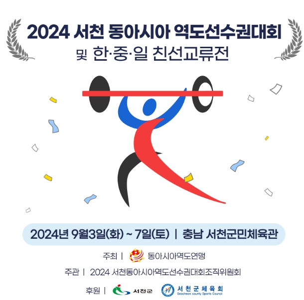 이번 대회는 동아시아역도연맹, 2024 서천동아시아역도선수권대회 조직위원회 등이 주최·주관하고 서천군과 서천군체육회 후원으로 개최된다.