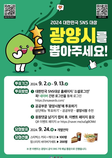 SNS 대상 투표 이벤트는 전 국민 누구나 참여할 수 있다. 대한민국 SNS 대상 홈페이지에서 네이버 간편 로그인을 진행한 후 '광양시청'에 투표하고 '투표하기와 응원댓글' 화면을 캡처해 이벤트 페이지에 응모하면 추첨을 통해 300명에게 커피+케이크, 햄버거 기프티콘을 증정한다.