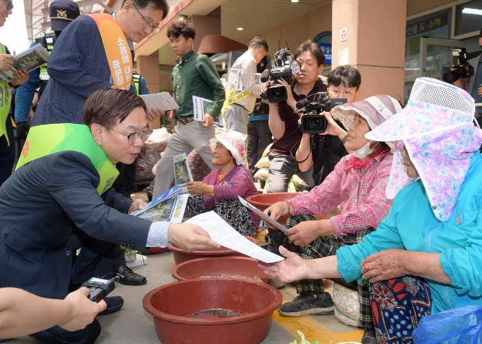 ![]() 고광완 광주광역시 행정부시장과 공직자들이 지난 5월 24일 오일장이 열리는 무안읍 장터에서 상인들에게 민·군 통합공항 이전 효과 등을 홍보하고 있다. /광주광역시 제공 |