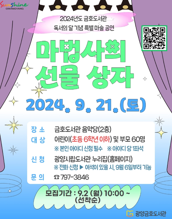광양금호도서관은 9월 독서의 달을 맞이해 온 가족이 소통할 수 있는 시간을 제공하고 지역 주민들의 마술 공연에 대한 요구를 충족시키기 위해 관객들의 호기심과 상상력을 키워줄 수 있는 볼거리를 준비했다.
