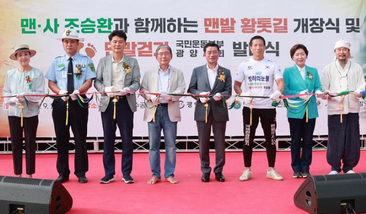 새로운 도심 명소의 탄생을 축하하는 이번 행사는 맨발 산책로 개장식, 맨발의 사나이 조승환 황톳길 명명식, 맨발걷기 국민운동본부 광양지회 발대식을 연계 진행해 의미가 더욱 커졌다.