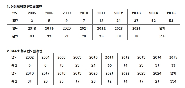 KIA 최형우는 꾸준하게 홈런을 기록하며 400홈런까지 다가섰다. 본격적으로 1군 무대에서 활약하기 시작한 2008시즌 이후로 최형우는 단 한 번도 두 자리 수 홈런을 놓치지 않았다.