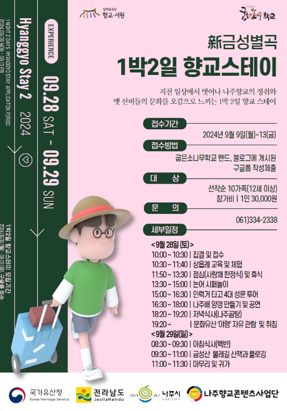 ‘新금성별곡 1박 2일 향교 스테이’ 는 유료로 운영되며, 참여 희망자(1인당 3만원)는 ‘나주향교 굽은 소나무학교’ 블로그나 (061)334-2338로 문의해 신청하면 된다.