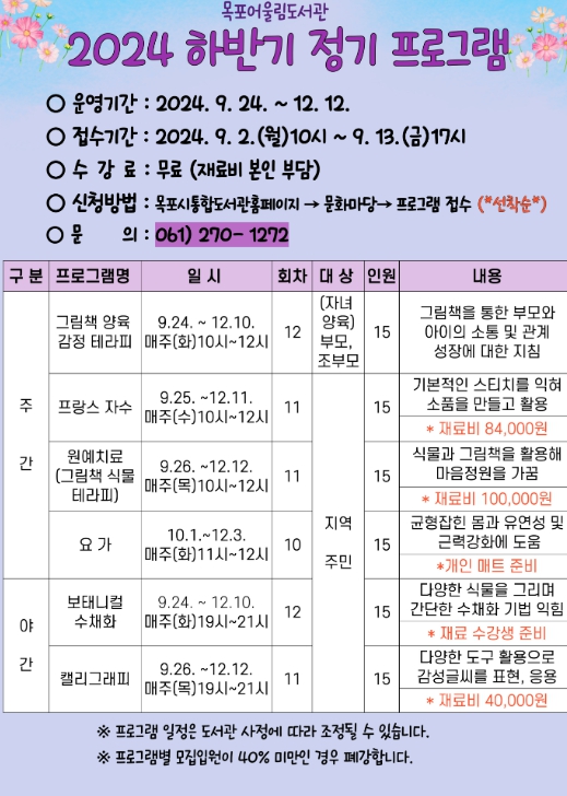 시 관계자는 “목포어울림도서관이 준비한 하반기 정기프로그램을 통해 지역 주민의 적극적인 평생학습 활동에 기여할 수 있기를 바란다”고 말했다.