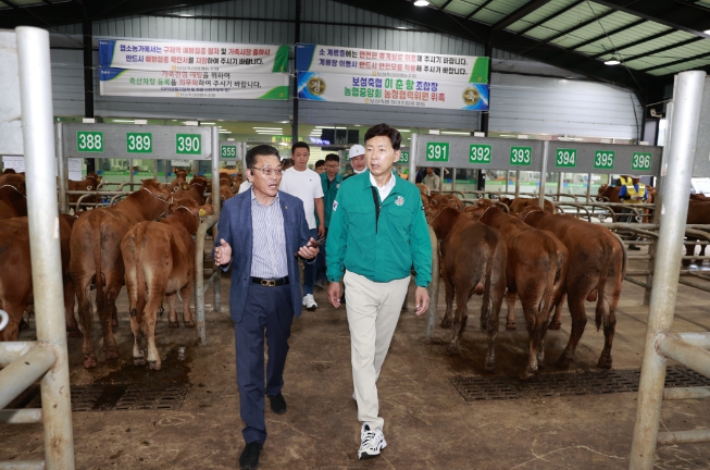 이날 김 군수는 한우 가격 동향과 거래 현황을 확인하고 축산농가의 애로사항 및 축산업 발전 현안에 대해 논의했다.