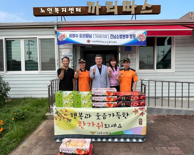 오승훈 전남소방본부장도 나주시 관내 노인복지센터 까리따스를 방문하여 “소소한 정성이지만 이웃과 함께 따뜻한 정을 나누는 명절을 보내는 데에 조금이나마 도움이 되길 바란다”며, “도민 모두가 안전한 추석 명절을 보낼 수 있도록 어려운 이웃에 지속적인 관심을 갖도록 노력하겠다”고 전했다.