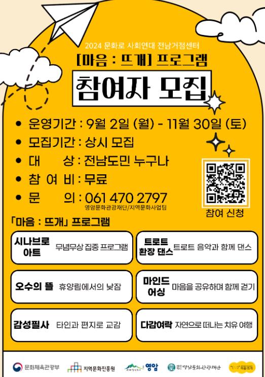 2024 문화로 사회연대 전남거점센터를 운영 중인 재단의‘마음:뜨개’프로그램은 ▲혼자 혹은 여럿이 모여 예술을 창작하는'시나브로 아트' ▲한국트로트가요센터에서 신나는 음악에 맞추어 무대 위에서 다같이 춤추는'트로트 환장댄스' ▲전남의 산림 휴양지에서 쾌적한 자연 속 낮잠을 즐기는'오수의 뜰' ▲전남지역에 조성된 황톳길을 처음 마주하는 사람들과 함께 걸으며 마음을 공유하는'마인드 어싱' ▲타 지역에 사는 사람들과 일상을 공유하는 편지 나누기'감성필사' ▲사는 곳을 잠시 떠나 전남의 매력을 새롭게 발견하는 여행'다감여락' 프로그램으로 11월 말까지 수시로 모집하여 운영되며 참가비는 무료이다.