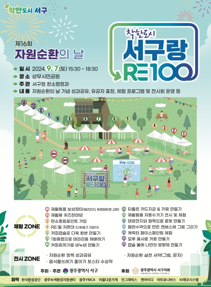 이번 행사는 착한도시 서구의 자원순환 성과를 공유하고 생활 속 자원순환 실천 문화를 확산하기 위해 마련됐으며, 서구는 올해 처음‘서구랑 RE:100(재활용의 모든 것)’이라는 주제로 일상 속 폐기물 재활용 체험 프로그램을 운영한다.
