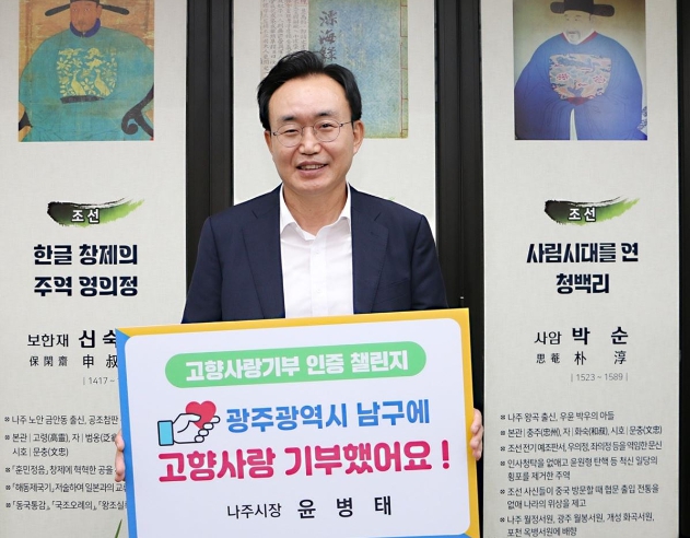 ![]() 윤병태 나주시장이 2년 연속 고향사랑기부 인증 챌린지에 참여했다. (사진제공-나주시) |