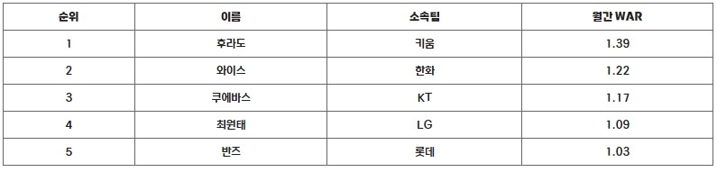 ![]() 8월 쉘힐릭스플레이어(WAR) 투수 최종 순위 |