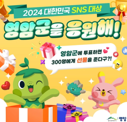 오병준 영암군 군정홍보과장은 “SNS 채널에서 다양한 주민의 참여로 만든 콘텐츠를 제작해 즐겁게 소통하는 일을 꾸준히 이어오고 있다. 대한민국 SNS 분야 최고 지자체로 선정되도록 투표와 이벤트에 많은 관심과 참여 바란다”고 전했다.