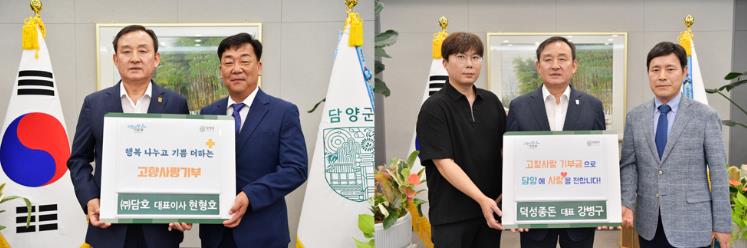 담양군은 담양군 금성면에 자리한 신재생에너지 전문기업인 ㈜담호의 현형호 대표이사와 금성면에서 양돈업을 운영하는 덕성종돈영농조합법인 강병구 대표가 기부금을 기탁하며 담양 지역발전에 힘을 보탰다고 4일 전했다.