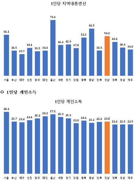 이에 따른 전남의 1인당 총생산은 5천418만 원으로, 전국 평균(4천505만 원)을 크게 웃돌면서 울산과 충남, 서울에 이어 전국 4위를 기록했다.