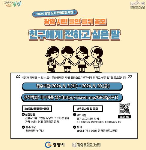 ![]() 광양문화도시센터, 글귀 공모전 개최 “친구에게 전하고 싶은 말” |