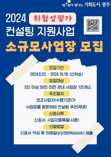 접수는 오는 10월 18일까지이며, 산업재해예방 컨설팅을 받고자 하는 사업자는 광주시 누리집 ‘고시·공고’에서 위험성 평가 컨설팅 대상 사업장 모집 공고를 확인하면 된다.
