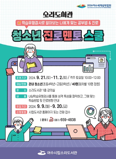 ![]() 여수시립소라도서관은 관내 초등학교 4학년~고등학교 3학년 학생을 대상으로 ‘청소년 진로 탐색 프로그램’ 참여 희망자를 오는 9일부터 선착순 모집한다. |
