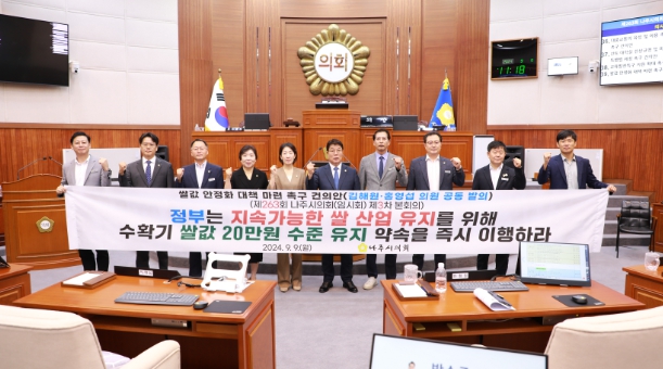 나주시의회는 건의안을 통해 ▲정부는 지속가능한 쌀 산업 유지를 위해 수확기 쌀값 20만원 수준 유지 약속을 즉시 이행할 것과 ▲매년 반복되는 쌀값 문제를 해결할 수 있는 항구적이고 실효적인 쌀값 안정화 대책을 마련할 것을 강력히 촉구했다.