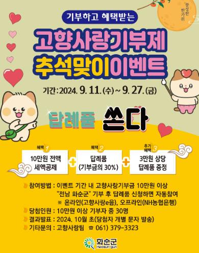 ![]() 화순군 고향사랑기부제 추석맞이 이벤트 진행 |