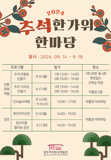 광주역사민속박물관은 오는 14일부터 18일까지 박물관과 야외마당에서 ‘2024년 추석 한가위 한마당’ 행사를 진행한다. 민속놀이체험(14~18일), 퓨전국악공연(16~17일), 추석다과상 만들기 등 전통공예체험(16~17일)이 진행될 예정이다.