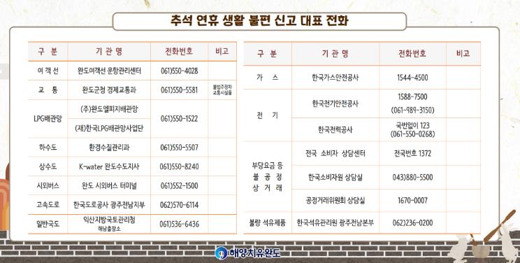 가스와 전기 등 생활 필수 에너지의 안정적인 공급을 위해 관계 기관과 합동으로 안전 점검을 실시하고, 연휴 기간에는 가스안전공사와 전기안전공사, 한국전력공사 완도‧강진‧고흥지사가 상황실을 운영하여 불편 사항을 접수·처리한다.
