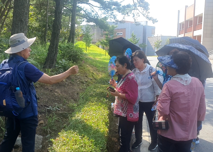 ![]() 숲해설 전문가로부터 설명을 듣는 참가자들 |