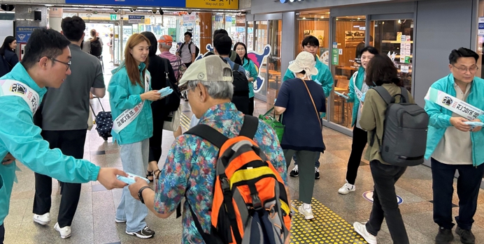 고향을 찾는 귀성객에게 홍보물품과 함께 따뜻한 환영인사를 전하고, 2025년 개최될 수묵비엔날레 일정과 장소 등을 안내한다.