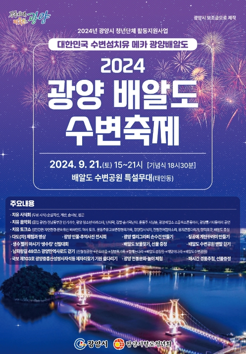 광양 배알도 수변축제는 ‘2024년 광양시 청년단체 활동지원’ 사업의 일환으로 광양시향토청년회 주관으로 개최된다.