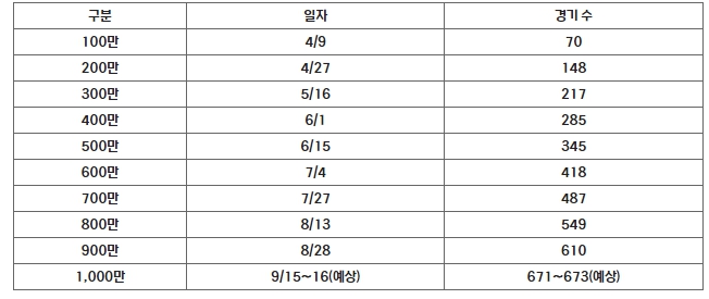 ![]() 2024 시즌 100만 단위 달성 일자 및 경기 수 |