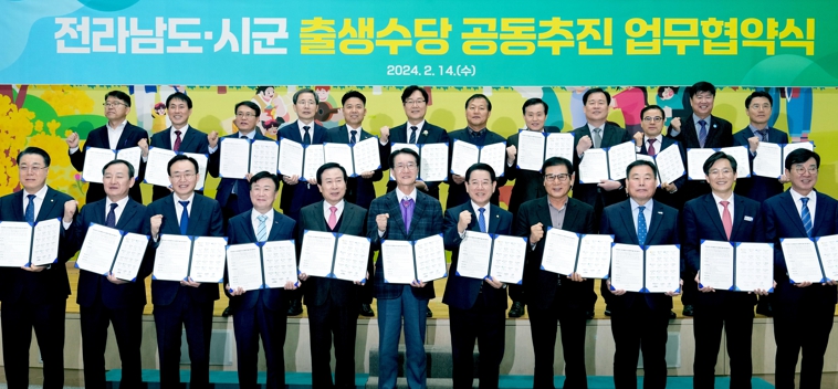 ![]() 전라남도가 올해를 ‘지방소멸 극복 원년’으로 삼아 인구문제 해결을 위해 전방위 노력을 펼치고 있다. 김영록 전라남도지사와 22개 시장·군수들이 지난 2월 14일 도청에서 전남·시군 출생수당의 성공적 추진을 위한 업무협약을 하는 모습 |