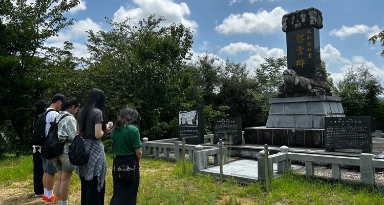 ![]() 학생들이 미이케 탄광 조선인 강제징용자들을 위한 위령비 앞에서 참배하고 있다. |