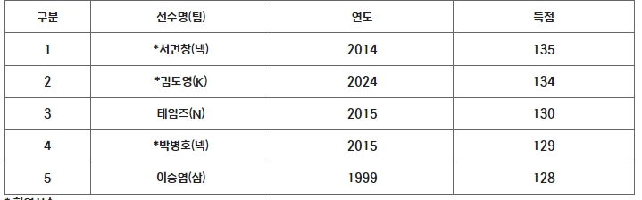 ![]() 역대 한 시즌 최다 득점 TOP5 9/16(월) 기준 |