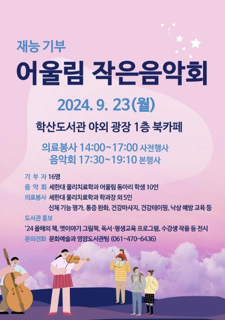 9월 독서의 달 행사의 하나로 열리는 이날 음악회와 봉사는 세한대학교 물리치료학과 이홍주 학생을 포함한 동아리가 진행한다.