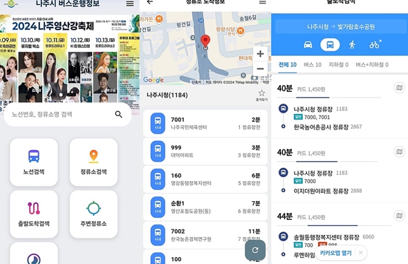 사용 예시로 정류소 검색에서 ‘나주시청’을 검색하면 나주시청을 경유하는 모든 버스의 실시간(분 단위) 운행 정보와 노선을 확인할 수 있다.