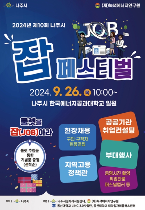 전라남도 나주시는 오는 26일 오전 10시부터 오후 6시까지 나주 혁신도시에 위치한 한국에너지공과대학교(켄텍·KENTECH) 일원에서 ‘제10회 잡페스티벌’을 개최한다고 20일 밝혔다.