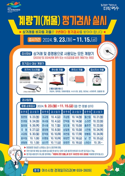 ![]() 여수시(시장 정기명)는 9월 23일부터 11월 15일까지 상거래용으로 사용되는 계량기(저울)에 대한 정기검사를 시행한다. |