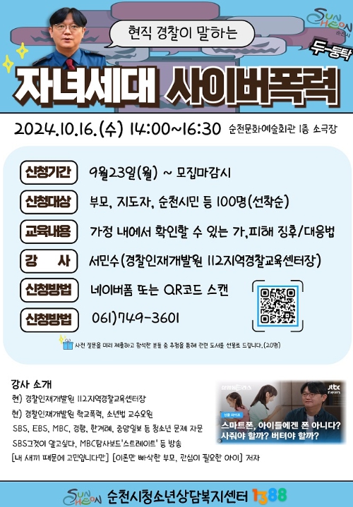 ![]() 2024 전문가 초청 부모 토크 콘서트 「자녀세대 사이버폭력」 개최 |