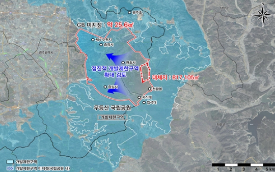 무등산 국립공원은 전체 면적 75.4㎢ 중 49.8㎢가 그린벨트로 지정됐고, 나머지 25.6㎢는 그린벨트로 지정되지 않은 상태다.