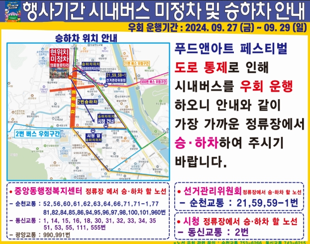 시 관계자는 “순천의 특별한 맛과 멋으로 가득 찬 거리 축제의 장을 열기 위해 차량과 버스 우회가 불가피한 점 양해 부탁드린다”며, “시민 불편을 최소화하면서도 성공적 축제가 되도록 행사 기간 노선 운행에 만전을 기하겠다”고 밝혔다.