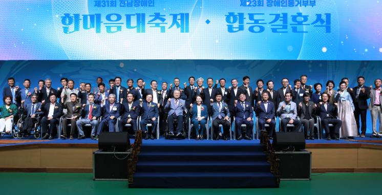 한국지체장애인협회 전남협회가 주관한 이날 행사는 이철 전남도의회 부의장, 장애인 유관 단체장 및 회원 등 1천500여 명이 참석한 가운데 기념식, 장애인 동거부부 합동결혼식, 어울림 한마당 잔치, 노래자랑 등 다채로운 프로그램으로 진행됐다.