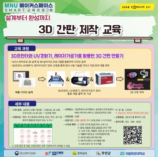 현재, ‘전문메이커 창업교육 과정 2기’ 프로그램은 10월 1일까지 선착순으로 신청자를 모집 중이며, 전남도민 또는 목포대학교 재학생은 교육비의 50% 할인을 받을 수 있다.