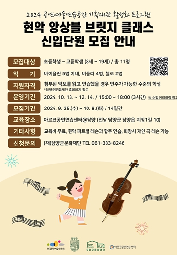 10월 13일부터 매주 일요일 오후 3시부터 6시까지 ‘아르코공연연습센터@담양’에서 진행되며, 초등학생부터 고등학생까지 미래세대라면 누구나 지역 제한 없이 참여할 수 있다. 7회 동안 현악 앙상블 활동 위주의 레슨과 테크닉 지도가 이루어지며 마지막 수업에는 현악 앙상블 성과발표회가 예정되어 있다.