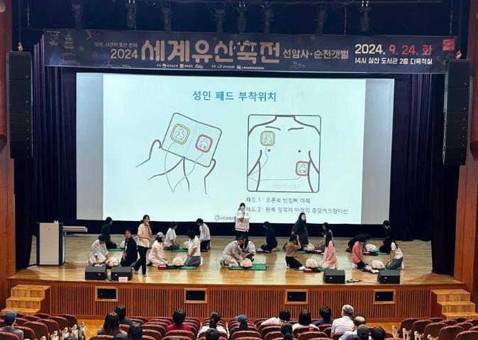 교육 내용은 ▲축전 안내 ▲프로그램 운영 실무 ▲심폐소생술 및 응급처치법 ▲위험상황 대처요령 등으로 구성되어 순천소방서의 협조로 진행됐다.