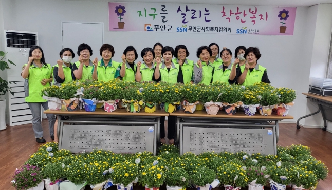 무안군자원봉사센터와 좋은이웃들 자원봉사자들은 폐현수막을 제단 및 재봉하여 만든 반려 화분을 독거 어르신 100명에게 나눠주며 우울증 예방과 심리적 안정감을 제공했다.