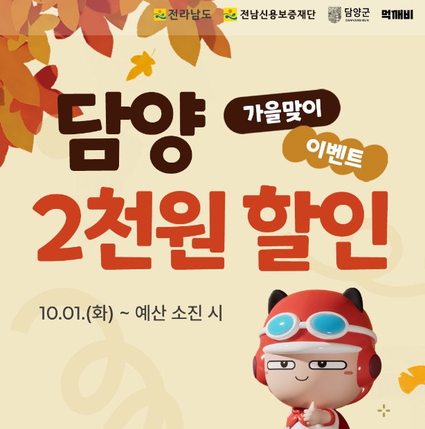 ![]() 담양군, 공공 배달앱 ‘먹깨비’ 황금연휴·가을맞이 특별할인 행사 |