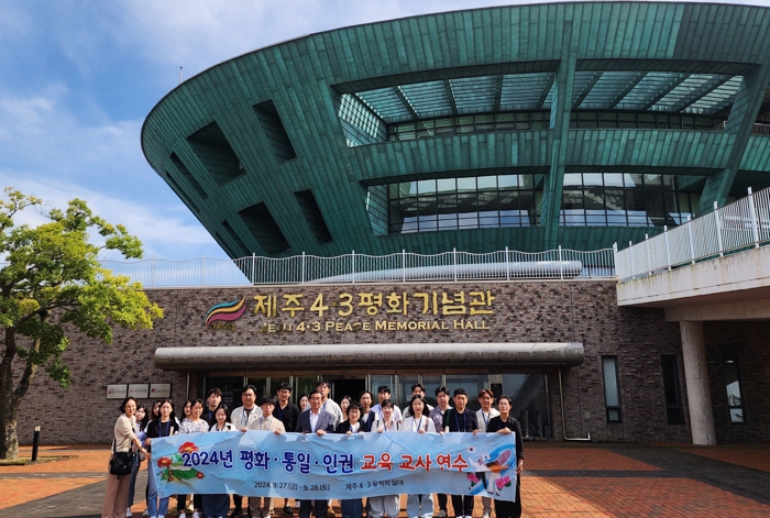 ![]() 평화·통일·인권 교육 교사 연수에 참여한 연수생들이 제주 4.3평화기념관 앞에서 기념 촬영하고 있다. |