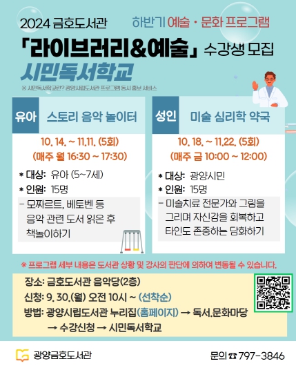 ![]() 광양시 금호도서관, 하반기 ‘라이브러리&예술’ 프로그램 수강생 모집 |