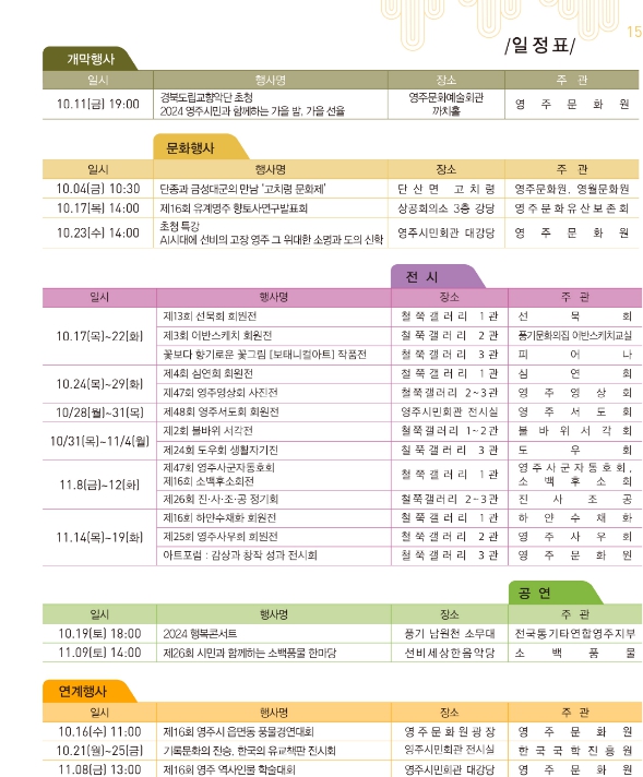 또, 17일 오후 2시 ‘제16회 유계영주향토사 연구발표회’와 19일 오후 6시 풍기 남원천 소무대에서 ‘2024 통기타 행복 콘서트’, 23일 오후 2시에는 인문학 초청특강이 시민회관 강당에서 진행될 예정이다.