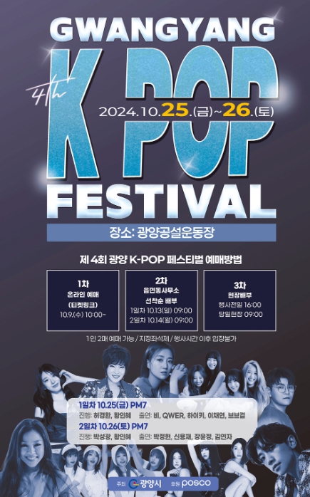 김성수 관광과장은 “오는 9일 티켓오픈을 시작으로 제4회 광양 K-POP 페스티벌에 대한 관심과 열기가 뜨거워질 것으로 예상된다”라며 “모든 사람에게 축제 관람 기회를 공평하게 제공하기 위해 입장권 배부 일정과 배부 방식을 세분화한 만큼 광양시민과 관광객의 많은 관심과 참여를 바란다”라고 말했다.
